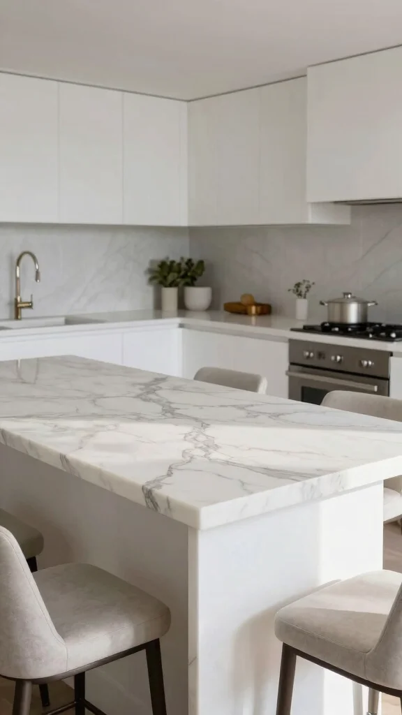 Enhance your white kitchen island with luxurious natural stone countertops like granite or quartzite. These materials offer durability and introduce stunning patterns that contrast beautifully with white cabinetry. Opt for lighter shades for a seamless look or bold veined options to create a dramatic statement.To keep costs in check, explore local suppliers for remnants or discounted slabs. This allows you to enjoy high-end materials without overspending.Advantages of Natural Stone:– Unique patterns that add character to your design.