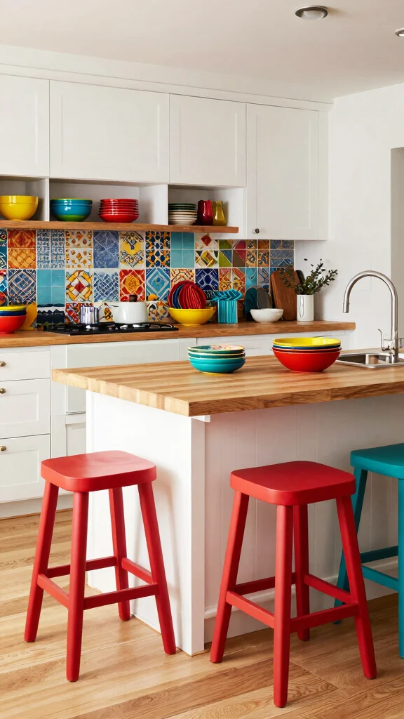 Matching colorful textiles, such as kitchen towels or placemats, can create a cohesive look that ties everything together. This technique invites a playful spirit into your kitchen while maintaining the elegance established by the white oak island.