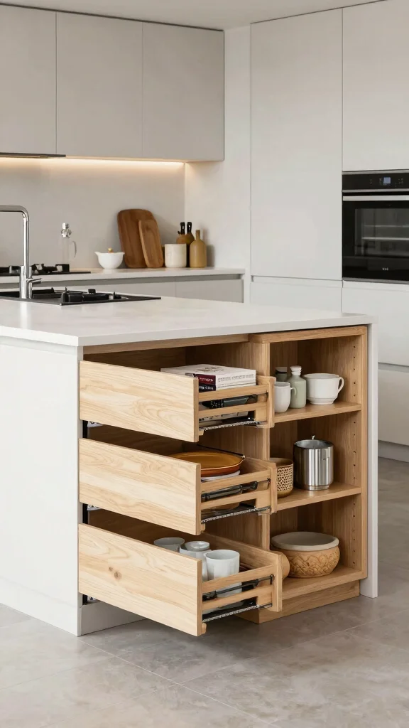 Opting for open shelving on one side of the island can create an inviting display for cookbooks or decorative items, merging utility with charm. This combination ensures your kitchen remains efficient while still reflecting your personal style.