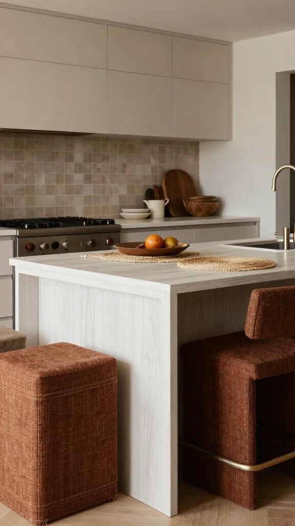 Layering textures through various textiles, like woven placemats or rich fabrics for barstools, can further elevate the tactile quality of your kitchen, creating a layered ambiance that feels rich and inviting.